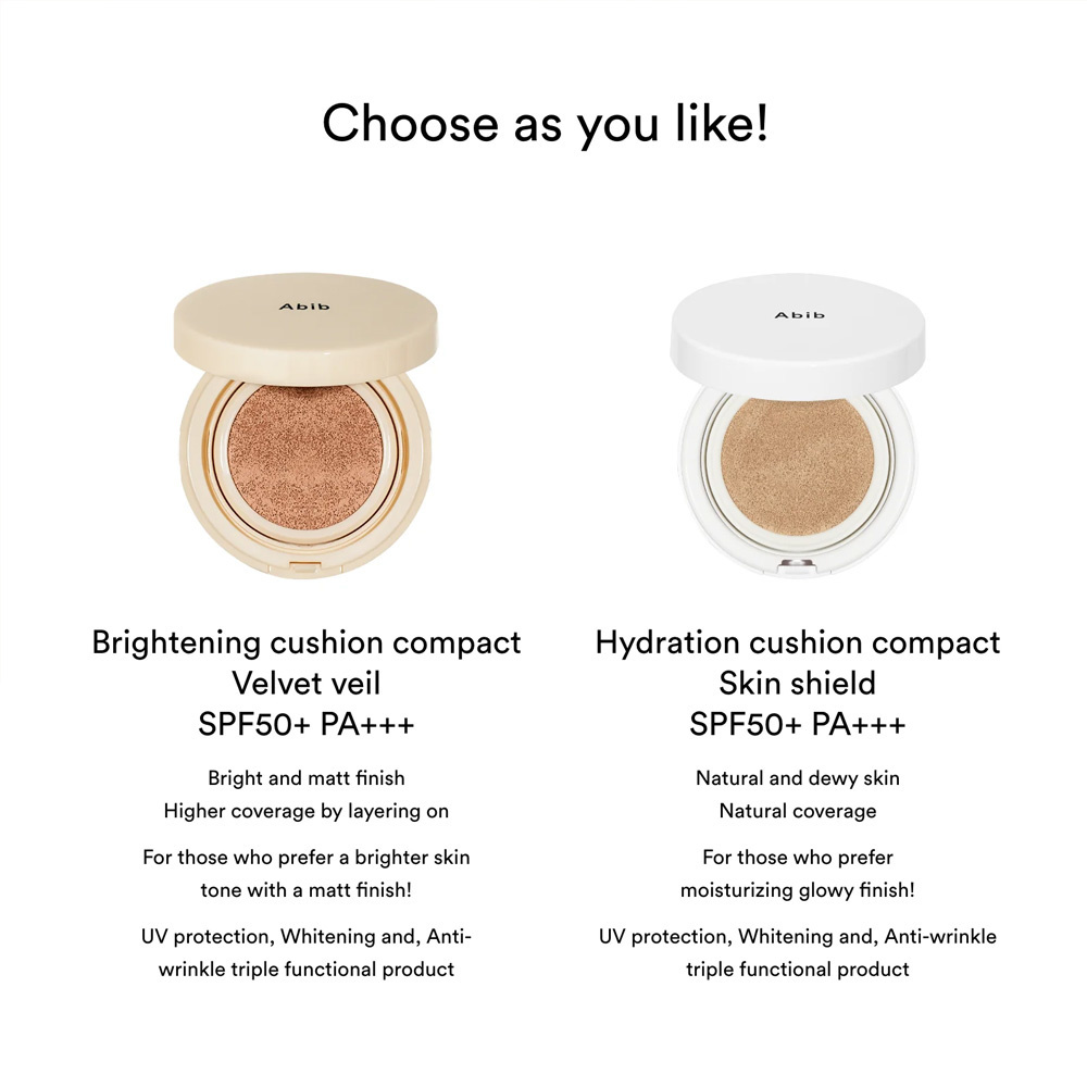 Abib Brightening Cushion Compact Velvet Veil is a cushion foundation that can range from light to full coverage due to its buildability without looking cakey. This foundation has a light texture and will give you a semi-matte finish with a subtle glow. 21P has a pink base while 21Y has a yellow base. Contains a refill.
