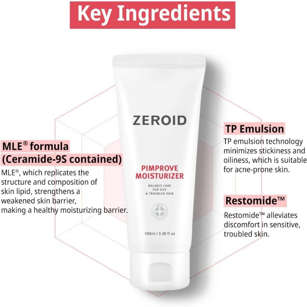 Zeroid Pimprove Moisturizer is a lightweight, hypoallergenic facial cream designed for oily, combination and acne-prone skin that easily becomes irritated or unbalanced. The formula helps calm redness, support skin barrier recovery and gently regulate sebum production. With its fast-absorbing texture, the skin feels comfortable, hydrated and matte, without any greasy or sticky residue.