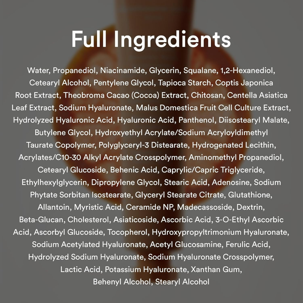 Water, Propanediol, Niacinamide, Glycerin, Squalane, 1,2-Hexanediol, Cetearyl Alcohol, Pentylene Glycol, Tapioca Starch, Coptis Japonica Root Extract, Theobroma Cacao (Cocoa) Extract, Chitosan, Centella Asiatica Leaf Extract, Sodium Hyaluronate, Malus Domestica Fruit Cell Culture Extract, Hydrolyzed Hyaluronic Acid, Hyaluronic Acid, Panthenol, Diisostearyl Malate, Butylene Glycol, Hydroxyethyl Acrylate/Sodium Acryloyldimethyl Taurate Copolymer, Polyglyceryl-3 Distearate, Hydrogenated Lecithin, Acrylates/C10-30 Alkyl Acrylate Crosspolymer, Aminomethyl Propanediol, Cetearyl Glucoside, Behenic Acid, Caprylic/Capric Triglyceride, Ethylhexylglycerin, Dipropylene Glycol, Stearic Acid, Adenosine, Sodium Phytate, Sorbitan Isostearate, Glyceryl Stearate Citrate, Glutathione, Allantoin, Myristic Acid, Ceramide NP, Madecassoside, Dextrin, Beta-Glucan, Cholesterol, Asiaticoside, Ascorbic Acid, 3-O-Ethyl Ascorbic Acid, Ascorbyl Glucoside, Tocopherol, Hydroxypropyltrimonium Hyaluronate, Sodium Acetylated Hyaluronate, Acetyl Glucosamine, Ferulic Acid, Hydrolyzed Sodium Hyaluronate, Sodium Hyaluronate Crosspolymer, Lactic Acid, Potassium Hyaluronate, Xanthan Gum, Behenyl Alcohol, Stearyl Alcohol.
