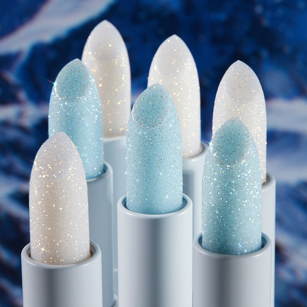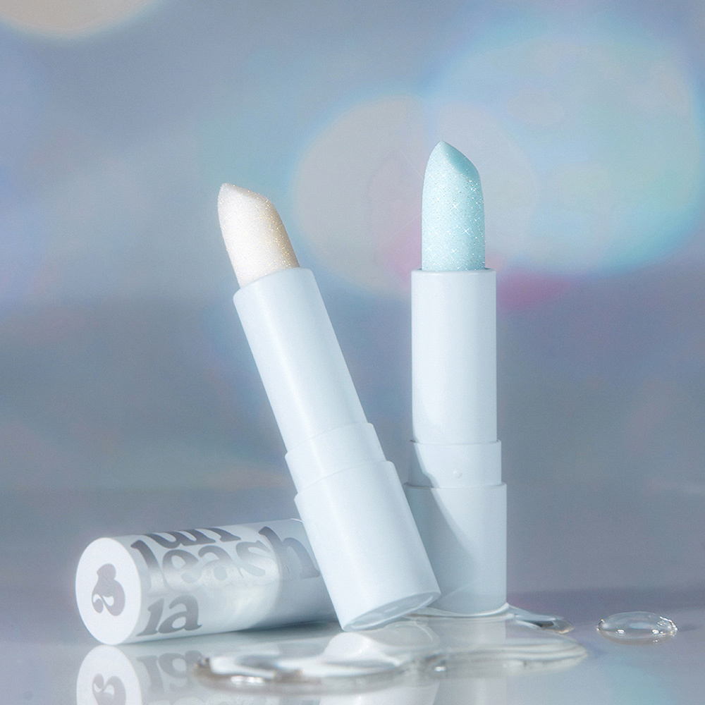 N°2 Blue Lagoon: A color changing lip balm with pink, blue and white silver shimmer pearls that will change to pink when applied on lips.