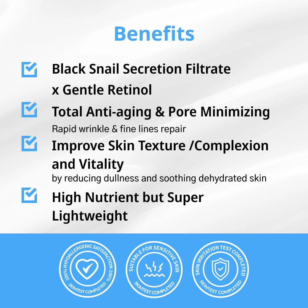 - Snail Secretion Filtrate: Contiene una complessa miscela benefica per la pelle, tra cui acido ialuronico, enzimi, peptidi di rame, zinco e ferro. Ha un'importante attività antiossidante e rende la cute tonica, elastica e idratata.