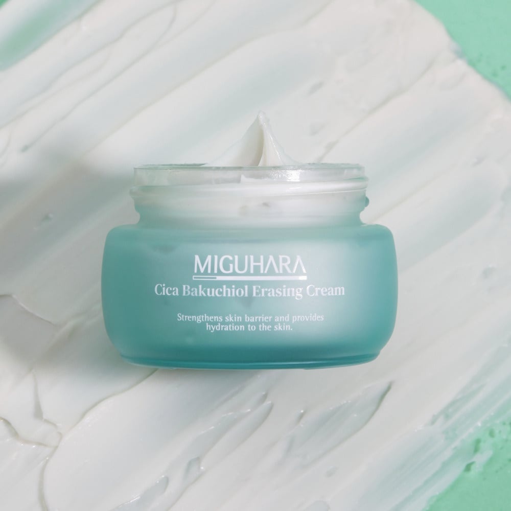 La Miguhara Cica Bakuchiol Erasing Cream contiene il 56% di estratto di Centella Asiatica e Bakuchiol per rafforzare la barriera idratante e lenire la pelle sensibile. Presenta un ingrediente Microbiome brevettato che aiuta a mantenere l'equilibrio della pelle e proteggerla dagli aggressori esterni. Questa formula vegana e ipoallergenica è adatta a tutti i tipi di pelle.