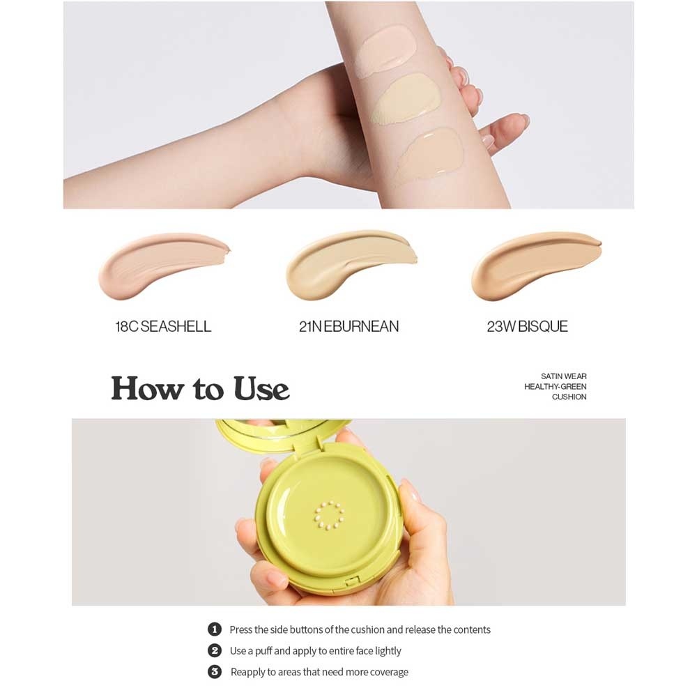 Unleashia Healthy Green Cushion ha una copertura naturale con una finitura satinata semi-matte. Il cushion contiene ingredienti come il bakuchiol, la papaya + la camomilla e l'estratto di prezzemolo e offre un fattore di protezione SPF30 PA++.